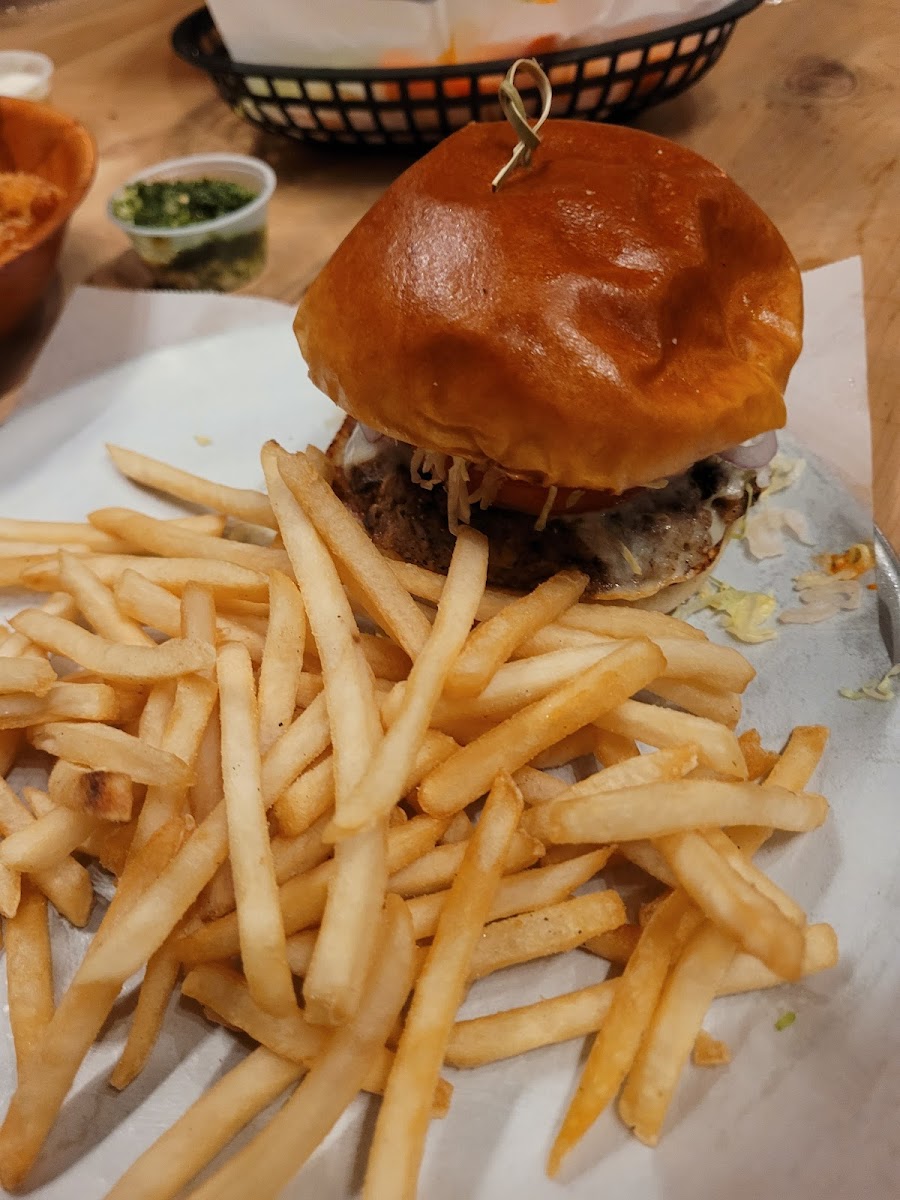 We decided to eat here after a trip to the Children’s Museum, we were walking by and thought, “why not?” And wow, we were not disappointed. We didn’t know what to expect but were quickly blown away. I don’t usually like ordering online at the table, but in this instance it worked to our favor because we had three very hungry kids and food came out very fast once we submitted our order. I ordered a GF pizza for myself and my husband along with a regular pepperoni pizza for the kids, some Thai chili chicken wings, and a GF burger with pimento cheese. First, this is one of the best GF pizzas we’ve had in Wilmington (second only to Benny’s) even my husband, who doesn’t have to eat GF, just does in solidarity, agreed it was phenomenal. Everyone was happy with the chicken wings and we loved the burger as well. Everything was a little pricey bc we had to pay extra for the GF items, but honestly I have to say it was worth the price. Overall we are extremely happy with the food and next time we want to eat outside, we didn’t even know they had a huge outdoor patio space! We can’t wait to go back.